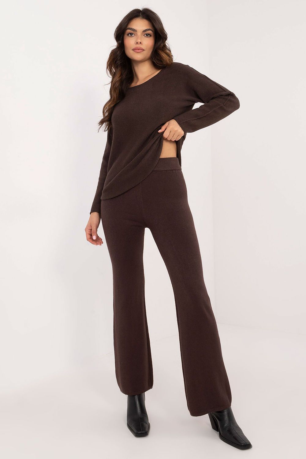 Ein lässiges Pullover-Set, bestehend aus einem bequemen Pullover und einer Hose, ideal für das tägliche Styling. Aus einer weichen Mischung aus Viskose, Polyester und Nylon gefertigt, ist es bequem und angenehm zu tragen. Die glatte Textur des Stoffes verleiht dem Set einen modernen, minimalistischen Look. Der Pullover hat lange Ärmel und einen Rundhalsausschnitt für eine klassische, vielseitige Passform. Die Hose mit weitem Bein und hoher Taille formt die Silhouette perfekt, und das Fehlen von Taschen verleiht ihr eine klare, elegante Linie. Ein stilvolles und bequemes Set für jeden Tag, perfekt für einen Spaziergang, die Arbeit oder zum Entspannen zu Hause.
