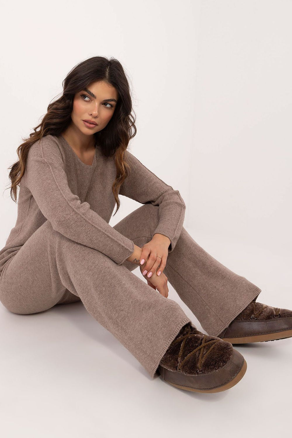 Casual-Sweat-Set, bestehend aus einem bequemen Pullover und einer Hose, ideal für den täglichen Look. Hergestellt aus einer weichen Mischung aus Viskose, Polyester und Nylon, bietet er Komfort und angenehmes Tragen. Die glatte Materialstruktur verleiht dem Set ein modernes, minimalistisches Aussehen. Der Pullover hat lange Ärmel und einen runden Ausschnitt, was einen klassischen, universellen Schnitt garantiert. Die Hose mit weitem Bein und hohem Bund formt die Silhouette perfekt, während das Fehlen von Taschen ihnen eine saubere, elegante Linie verleiht. Ein stylisches und bequemes Set für jeden Tag, ideal für einen Spaziergang, zur Arbeit oder zum Entspannen zu Hause.