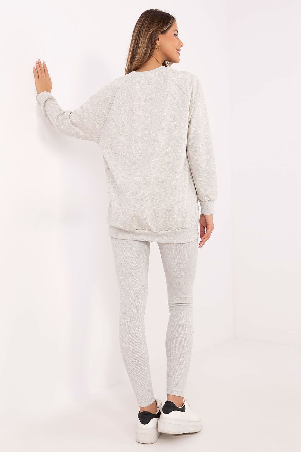 Ein Damenset bestehend aus einem Pullover und Leggings ist ein ausgezeichneter Vorschlag für den täglichen, legeren Look. Ideal für Frauen, die Komfort schätzen, aber gleichzeitig modisch und stilvoll aussehen möchten. Der Pullover mit klassischem Schnitt, rundem Ausschnitt und langen Ärmeln besteht aus einer hochwertigen Mischung aus Baumwolle, Polyester und Elasthan. Er ist angenehm im Griff, elastisch und langlebig und bietet den ganzen Tag lang Tragekomfort. Die dezenten Stickereien an den Ärmeln und an der Vorderseite verleihen ihm einen besonderen Charakter und betonen das moderne Design. Die Leggings mit schmal zulaufenden Beinen und hoher Taille sind die perfekte Ergänzung des Sets. Hergestellt aus Baumwolle mit einem Hauch von Elasthan, passen sie sich perfekt der Silhouette an und bieten volle Bewegungsfreiheit und Komfort. Das gesamte Set ist in einem glatten Muster gehalten, was es vielseitig und einfach zu kombinieren macht. Eine perfekte Wahl für den täglichen Gebrauch, Entspannung oder Freizeitaktivitäten im lockeren Stil.