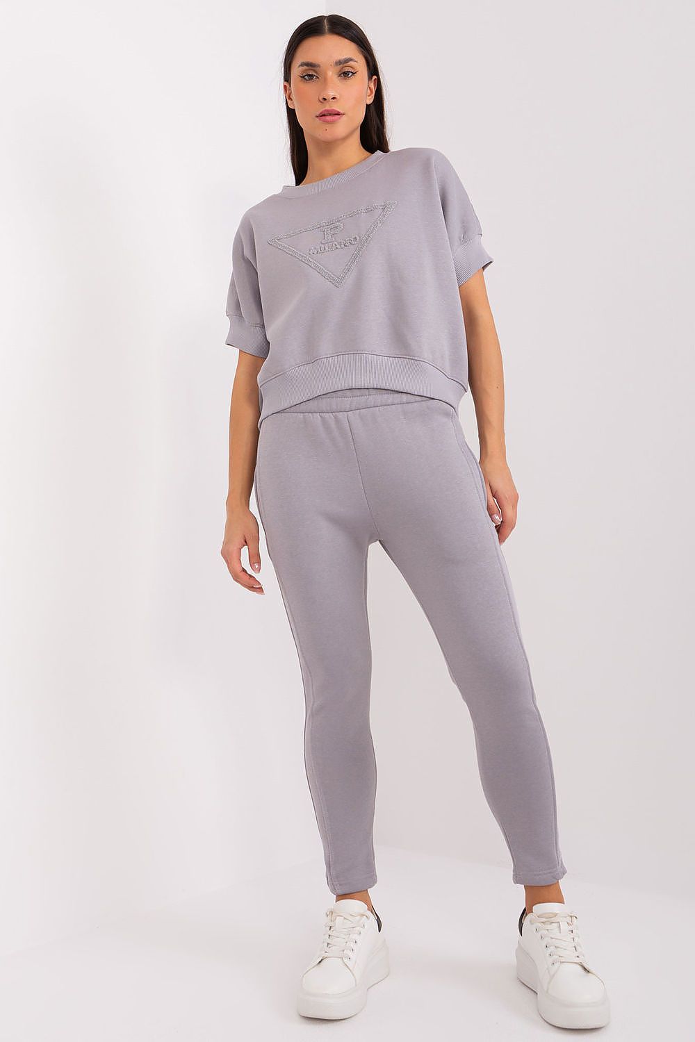 Ein isoliertes Damen-Trainingsanzug-Set im Casual-Stil, ideal für kältere Tage, bestehend aus einem Sweatshirt und einer Hose. Das Set besteht aus einer Kombination aus Baumwolle und Polyester und bietet Wärme, Komfort und Strapazierfähigkeit, ideal für das tägliche Styling. Das Sweatshirt in Standardlänge hat kurze Ärmel und einen Rundhalsausschnitt, wodurch es trotz der Wärme leicht und lässig wirkt. Der trendige Print auf der Vorderseite des Sweatshirts verleiht dem Set Originalität und einen jugendlichen Touch. Das glatte Design sorgt für einen minimalistischen, vielseitigen Look, der sich gut mit anderen Kleidungsstücken kombinieren lässt. Die Hose hat spitz zulaufende Beine und eine hohe Taille, um die Silhouette zu betonen und Komfort zu gewährleisten. Ein elastischer Bund sorgt für einen perfekten Sitz. Darüber hinaus ist die Hose mit seitlichen Eingrifftaschen ausgestattet, was sie zu einer praktischen Wahl für den Alltag macht. Dieses Set ist die perfekte Kombination aus Komfort und Stil für kalte, alltägliche Tage.