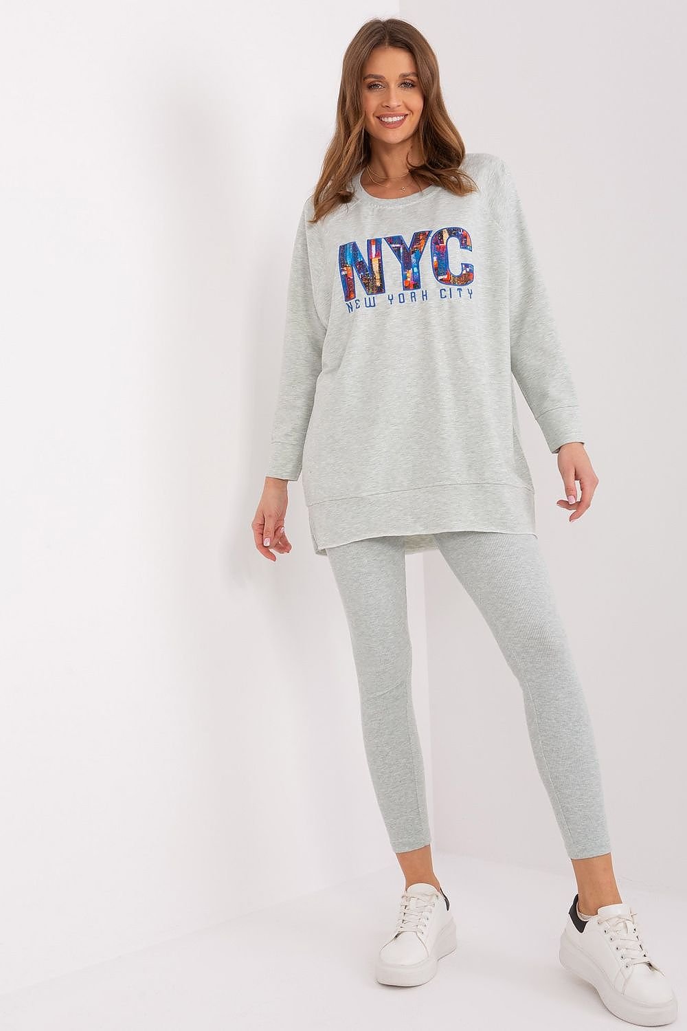 Das Damenset bestehend aus Sweatshirt und Leggings ist die perfekte Kombination aus Komfort und Stil. Das Sweatshirt hat einen Print auf der Vorderseite, der ihm einen einzigartigen Charakter verleiht und das moderne Design unterstreicht. Es ist aus einer Mischung aus hochwertiger Baumwolle, Polyester und Elastan gefertigt und bietet Komfort und Haltbarkeit. Die Leggings zeichnen sich durch ihren hohen Bund aus, der die Taille perfekt betont und für Komfort bei alltäglichen Aktivitäten sorgt. Die spitz zulaufenden Beine sorgen für eine perfekte Passform, während der gerippte Stoff für eine subtile Struktur und einen modischen Look sorgt. Das Set eignet sich perfekt für tägliche Ausflüge, Spaziergänge oder entspannte Momente zu Hause. Die Kombination aus universellem Stil und Funktionalität macht es zu einer guten Wahl für alle Jahreszeiten.